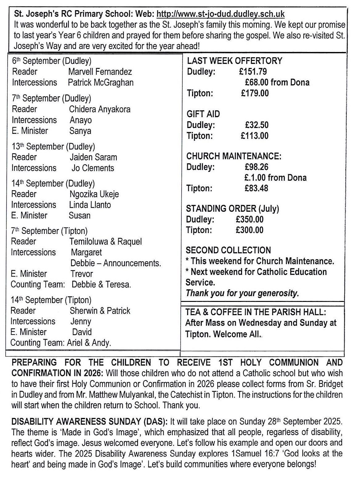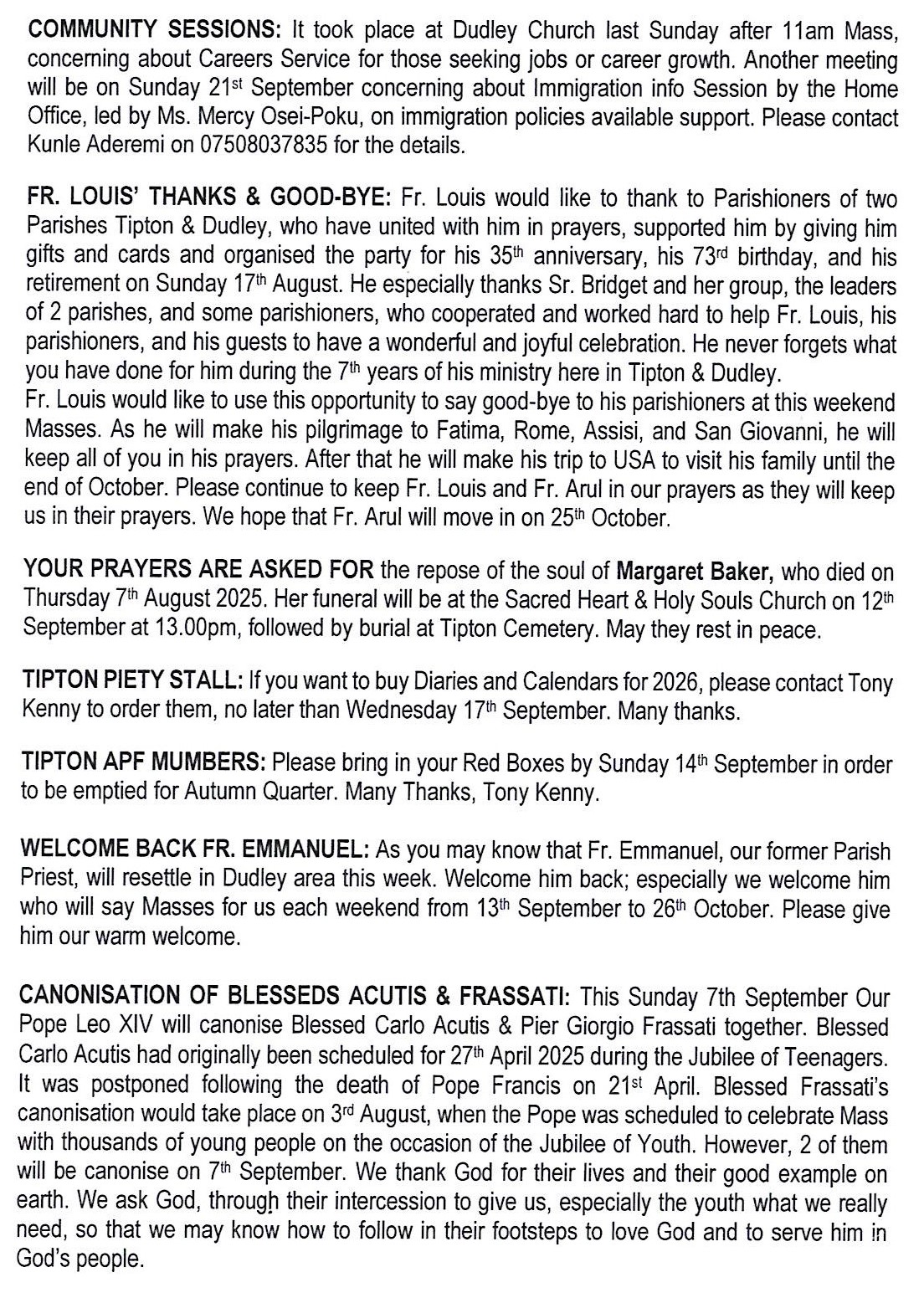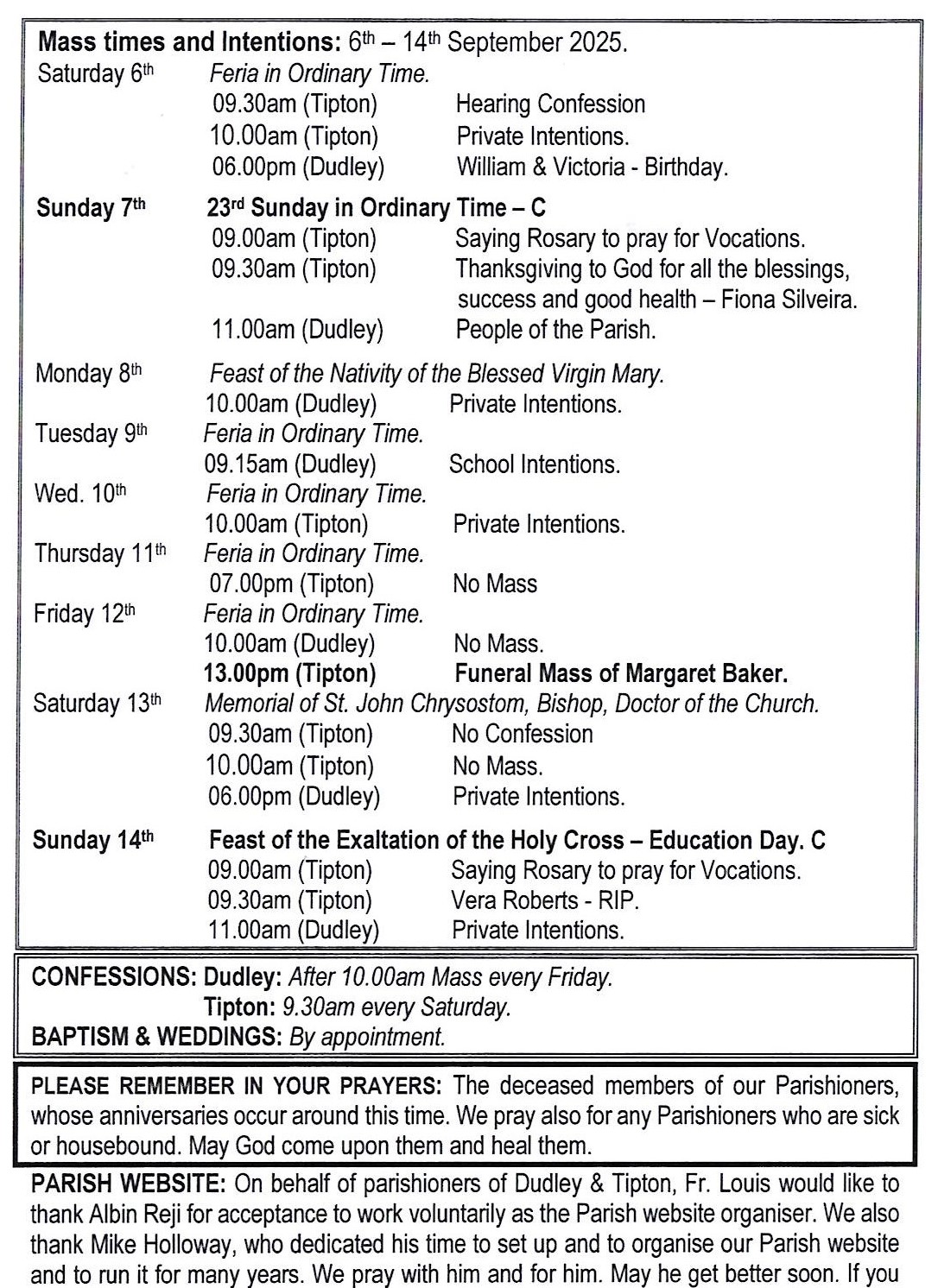 Parish Sister for Dudley is Sr. Bridget, Daughters of Divine Love. Tel.no. 07960938770 |